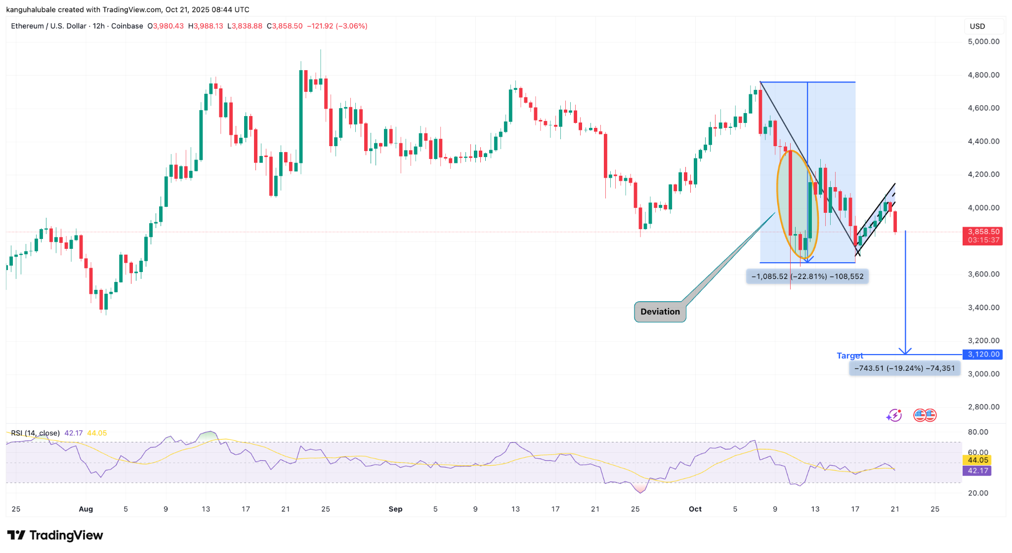 Ether (ETH) fell to $3,800 on Tuesday, failing to hold $4,000 as spot Ethereum ETF investors continued their net redemptions. This came as the technical setup pointed to a deeper correction for ETH price.