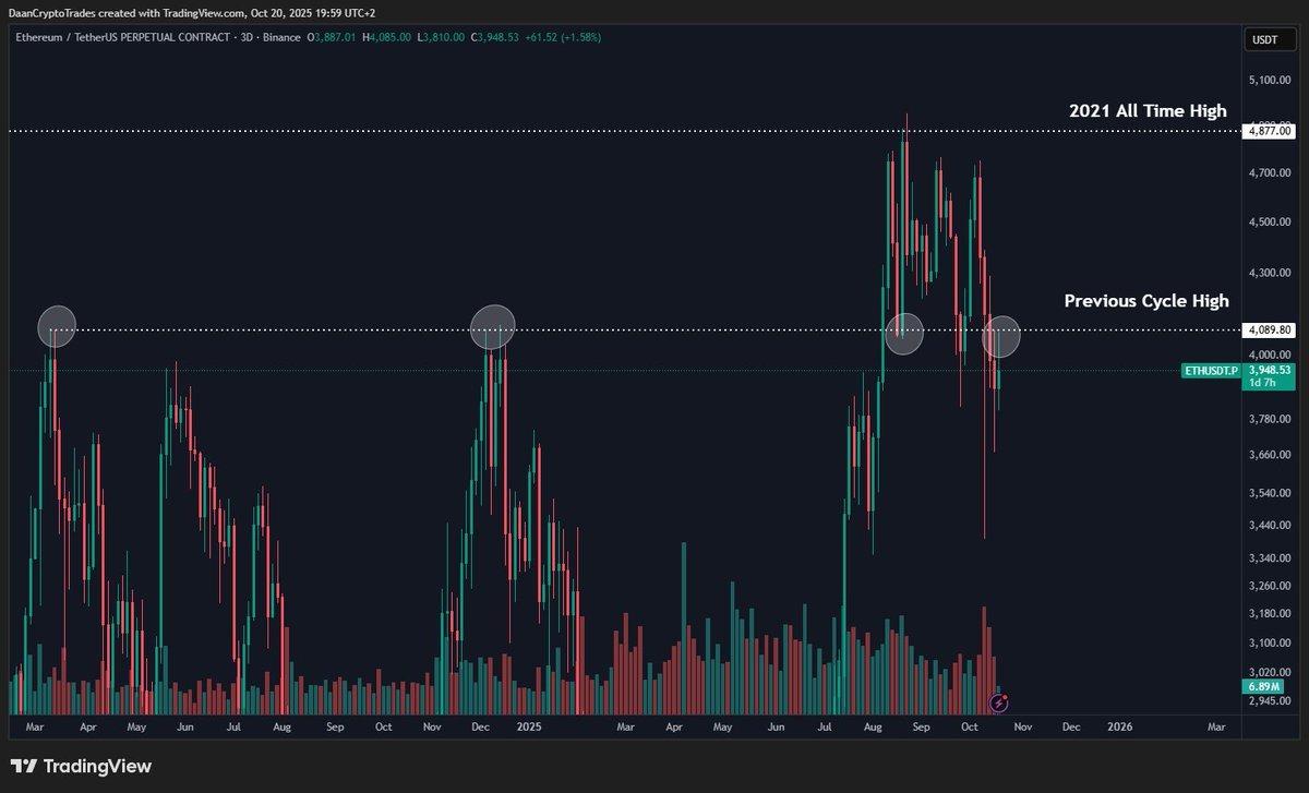 Analyst Jelle said that Ether is just retesting a key breakout level around $4,000 before resuming its uptrend.