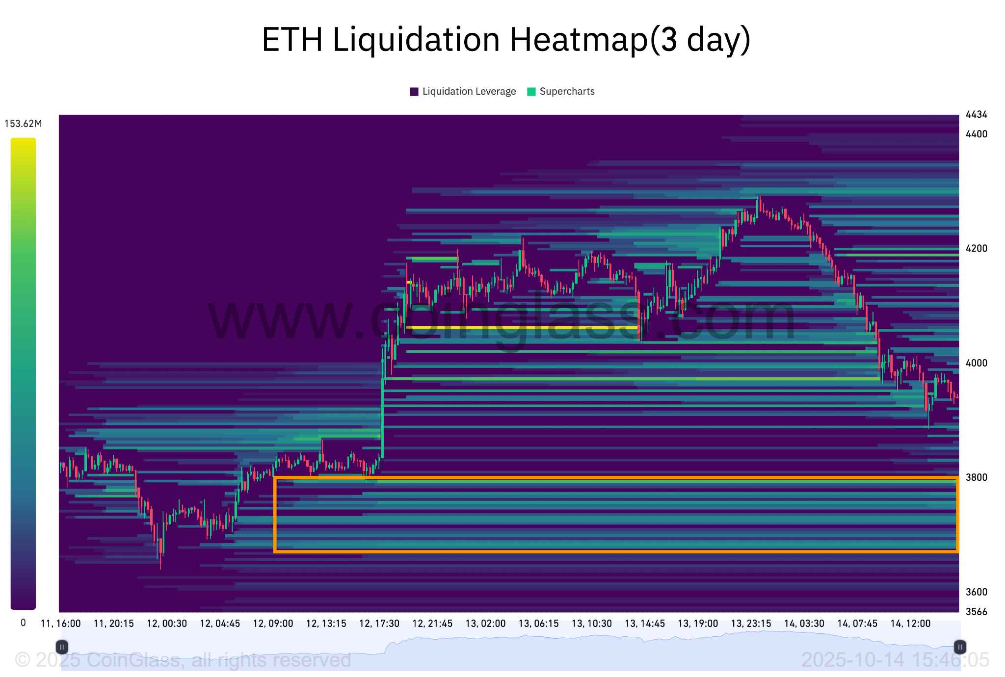 The CoinGlass liquidation heatmap showed several bands of buyer interest below the spot price, with bid orders worth over $743 million sitting between $3,670 and $3,800. This suggested that the ongoing correction might be capped at this level.