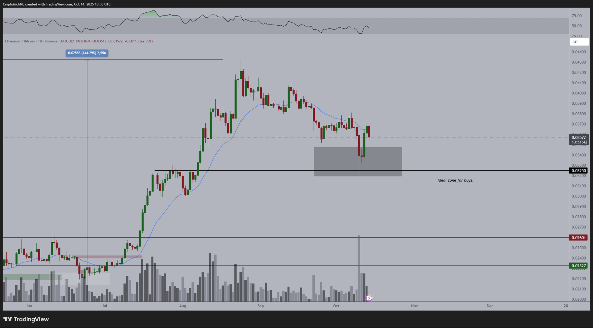 MN Capital founder Michael van de Poppe said that Sunday’s drop saw the ETH/BTC pair plunge to 0.032, which was an “ideal zone for buys.”