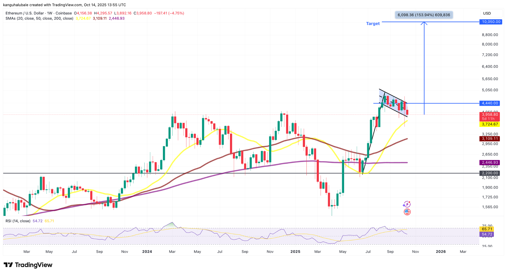 The bull flag will resolve once the price breaks above the upper trendline at $4,440, opening the path for the continuation of the uptrend toward the technical target of the bull flag at $10,050 — up 164% from the current price.