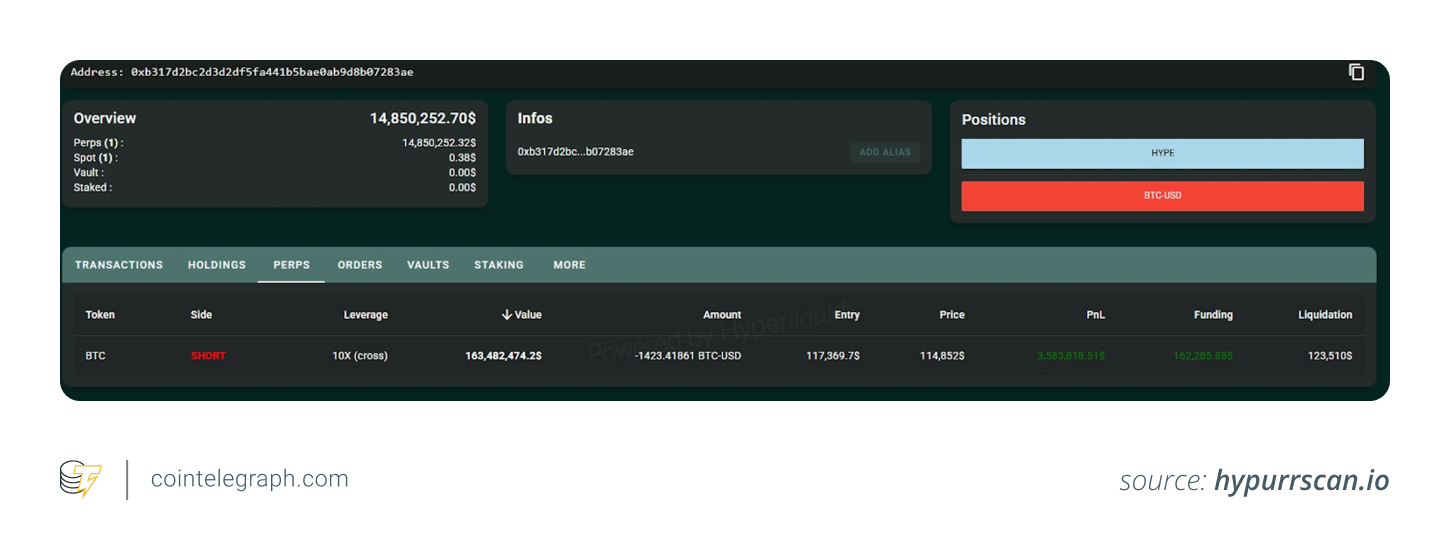 Wallet “0xb317” launches a new $163-million short against Bitcoin