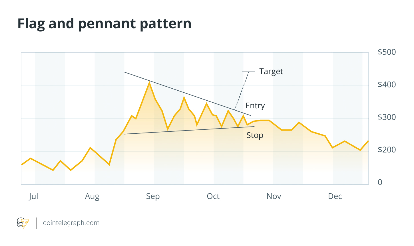 How to read: A steep “pole” followed by a short consolidation suggests that the trend is likely to resume. These patterns are bullish in uptrends and bearish in downtrends. Traders often enter on a pullback within the flag or pennant to improve risk-reward.