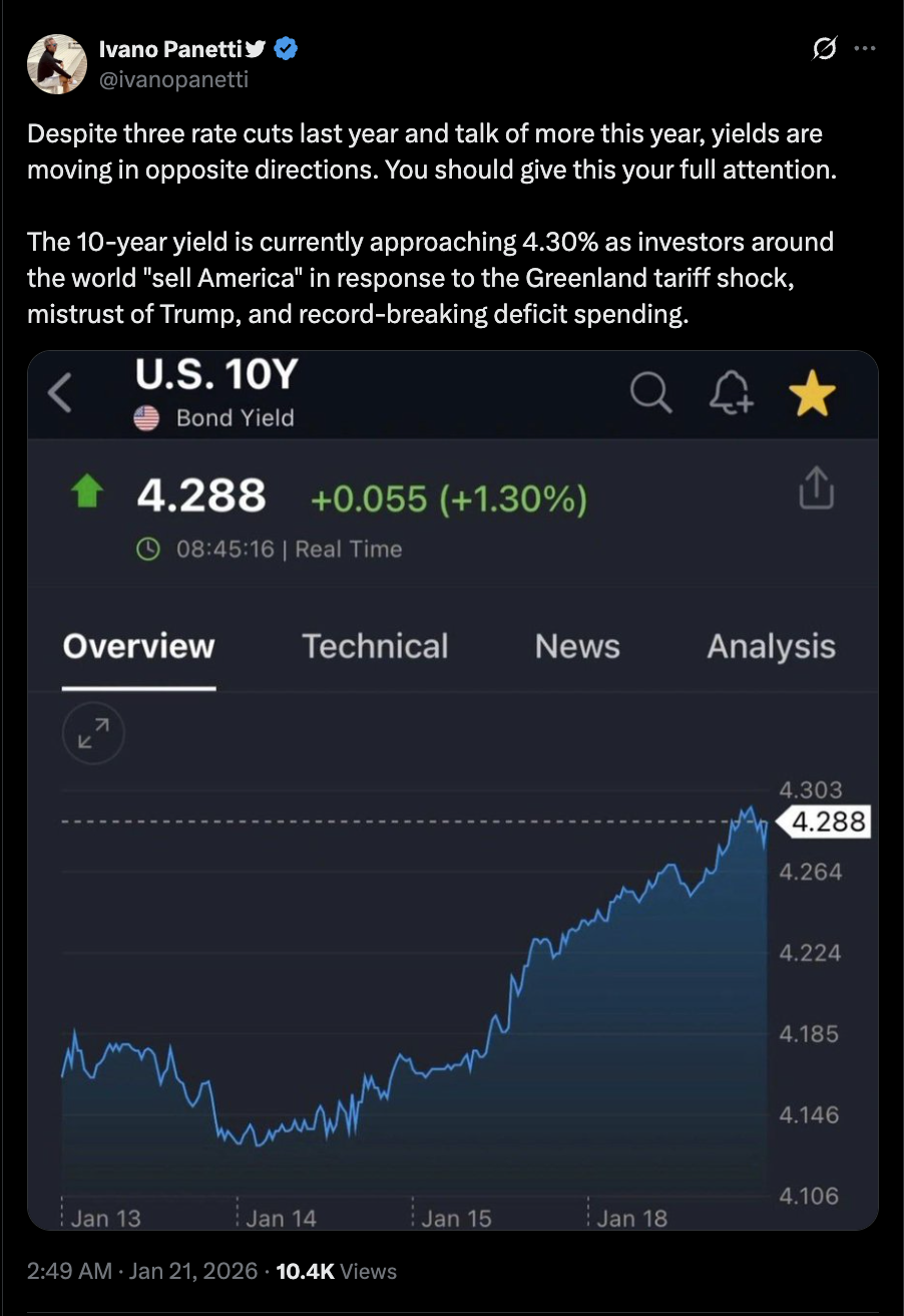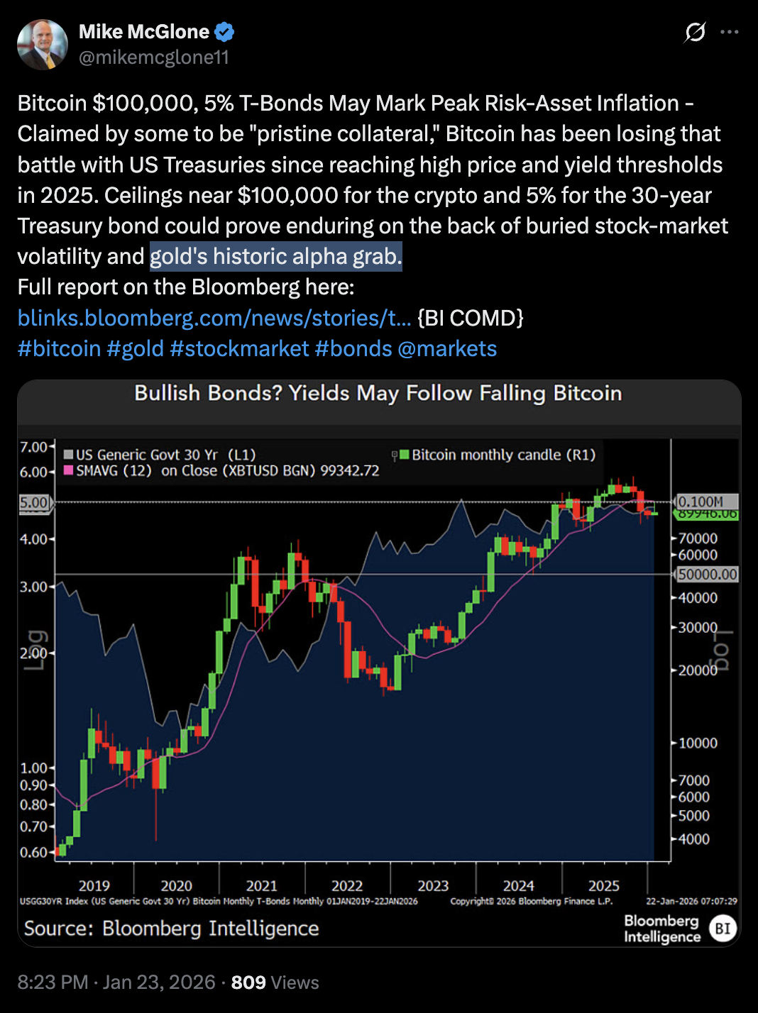 In a Friday post, McGlone argued that gold’s “historic alpha grab” is pulling capital toward the traditional inflation hedge at a time when higher long-term Treasury yields are also competing for flows.