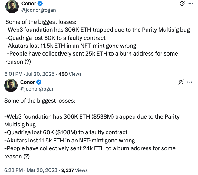 Grogan shared the estimate on X on Sunday, noting that the lost Ether due to human error and bugs (ETH) now accounts for more than $3.43 billion at current market prices.