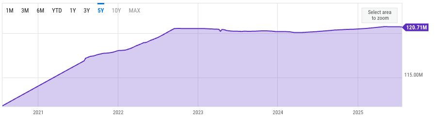 The supply then started to decline, dropping slightly by about 0.4% through April 2024, reflecting reduced issuance and ongoing ETH burns. Since then, however, the supply has resumed its gradual growth, reaching around 120.7 million ETH at the time of writing.