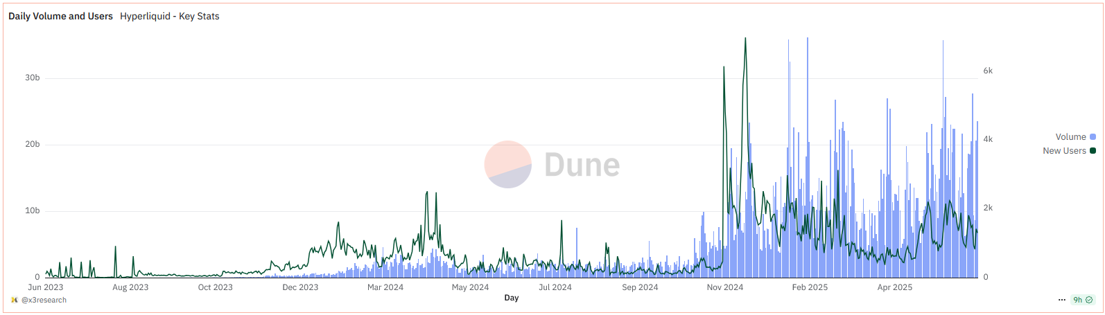 Hyperliquid daily volume and users. Source: @x3research on Dune Analytics