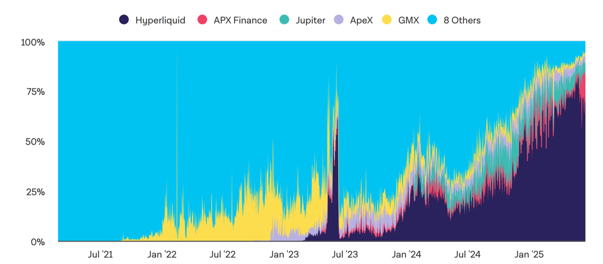 • Hyperliquid now leads the decentralized perpetuals market, processing over 70% of DEX perp volume.