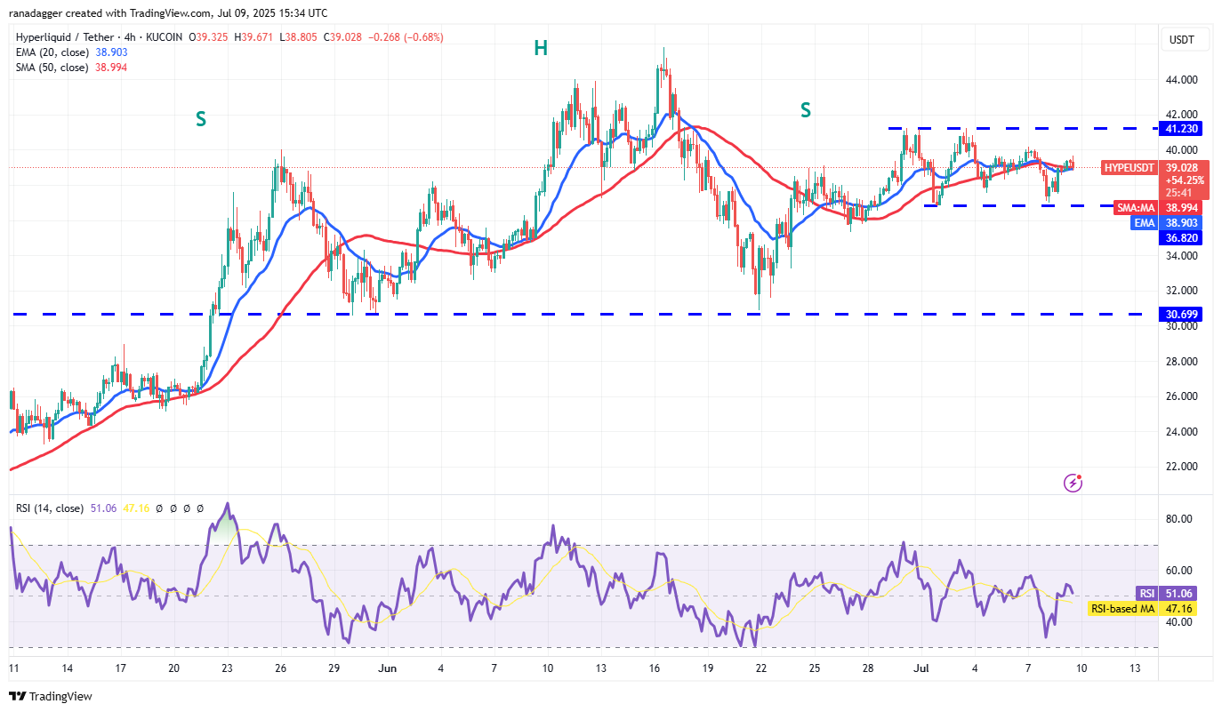 The gradually upsloping 20-day exponential moving average ($38.43) and the relative strength index (RSI) just above the midpoint indicate a slight edge to the bulls. The HYPE/USDT pair could rise to $41.23, which is a crucial overhead resistance. If this level is scaled, the pair could surge to $44 and later to $45.80.