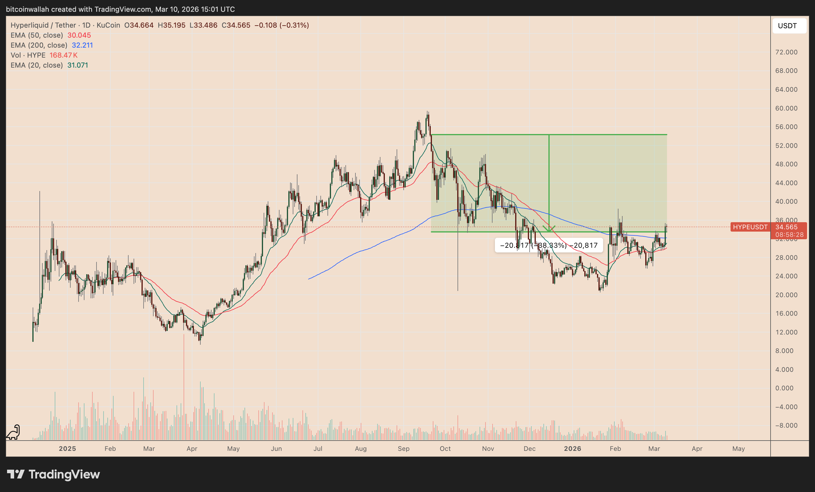 Applying the technical rule to HYPE gives a measured upside target of around $50 if the price breaks decisively above the $35.50 neckline resistance. If the pattern plays out, it will result in gains of more than 40% from current levels.