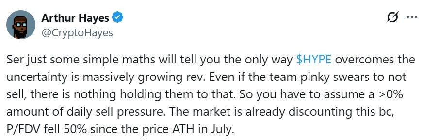 BitMEX co-founder Arthur Hayes issued a blunt warning that the upcoming unlocking event introduces unavoidable selling pressure for the token. He said that insider assurances cannot eliminate uncertainty