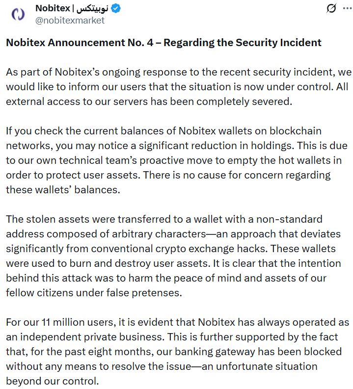 “As part of Nobitex’s ongoing response to the recent security incident, we would like to inform our users that the situation is now under control,” they said.