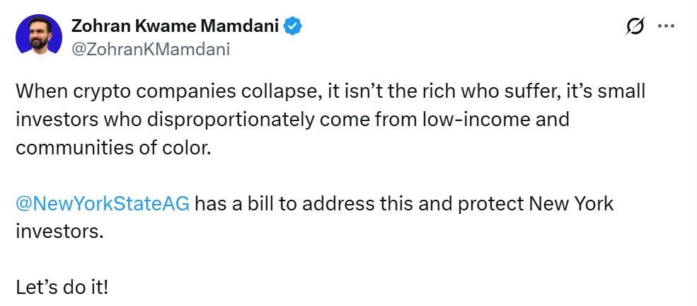 Mamdani’s concerns over consumer protection are far from fringe. US financial regulators and lawmakers, even pro-crypto ones, have called and continue to advocate for consumer protections as new crypto legislation makes its way through Congress.