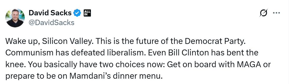 Sacks called on Silicon Valley, which is in California, to “wake up” to the supposed rising tide of communism in New York.