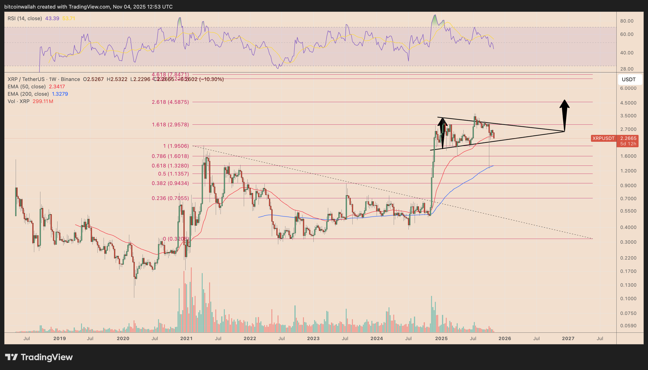 The support area aligns with the lower trendline of XRP’s prevailing symmetrical triangle structure and its 1.0 Fibonacci retracement trendline, as shown below.