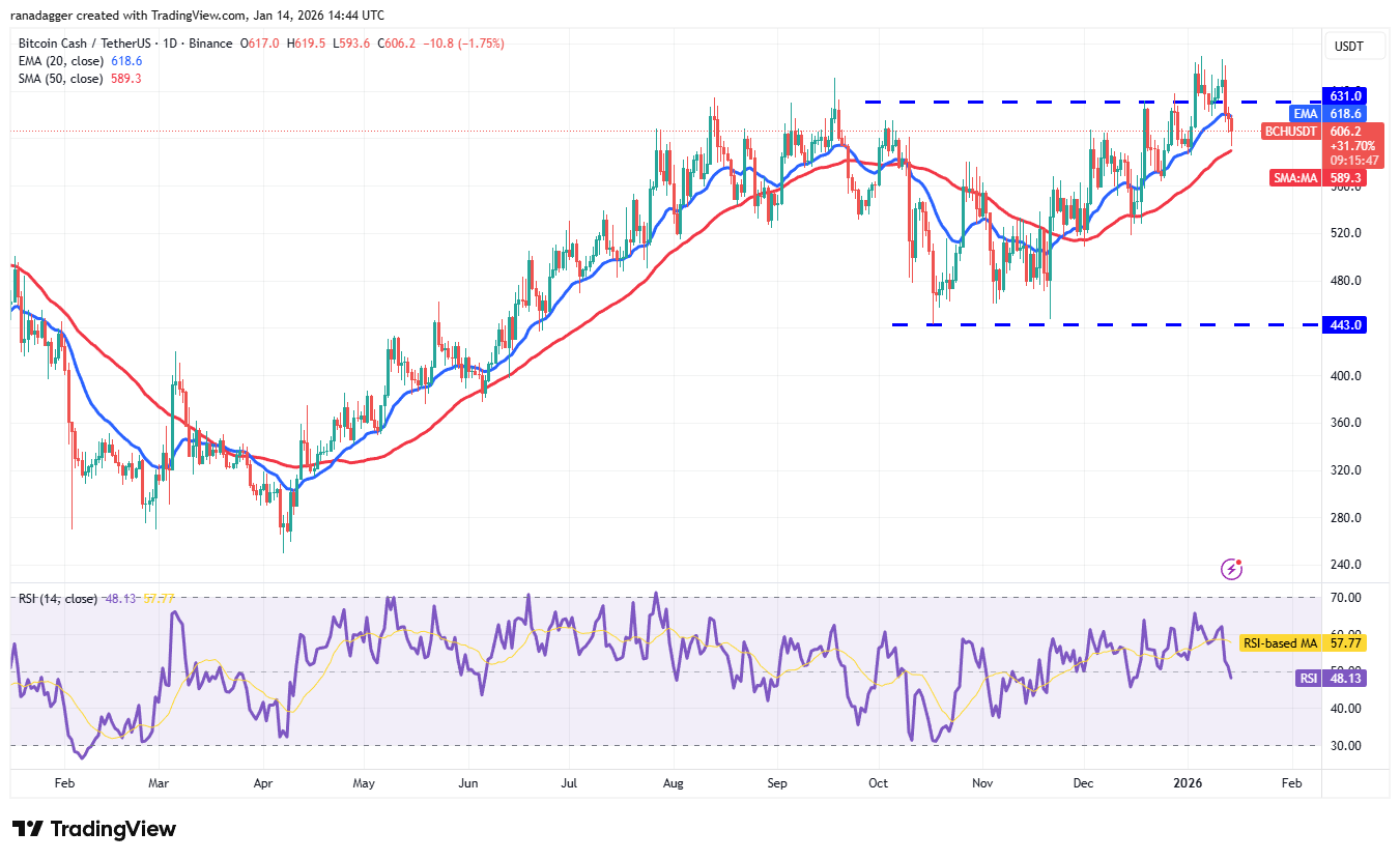 A break and close below the 50-day SMA ($589) suggests that the market rejected the breakout above the $631 level. That may trap the aggressive bulls, pulling the BCH/USDT pair to $563 and later to $518.