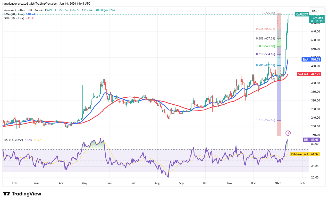 Monero (XMR) has rallied sharply since bouncing off the 20-day EMA ($510) on Saturday, indicating aggressive buying by the bulls.