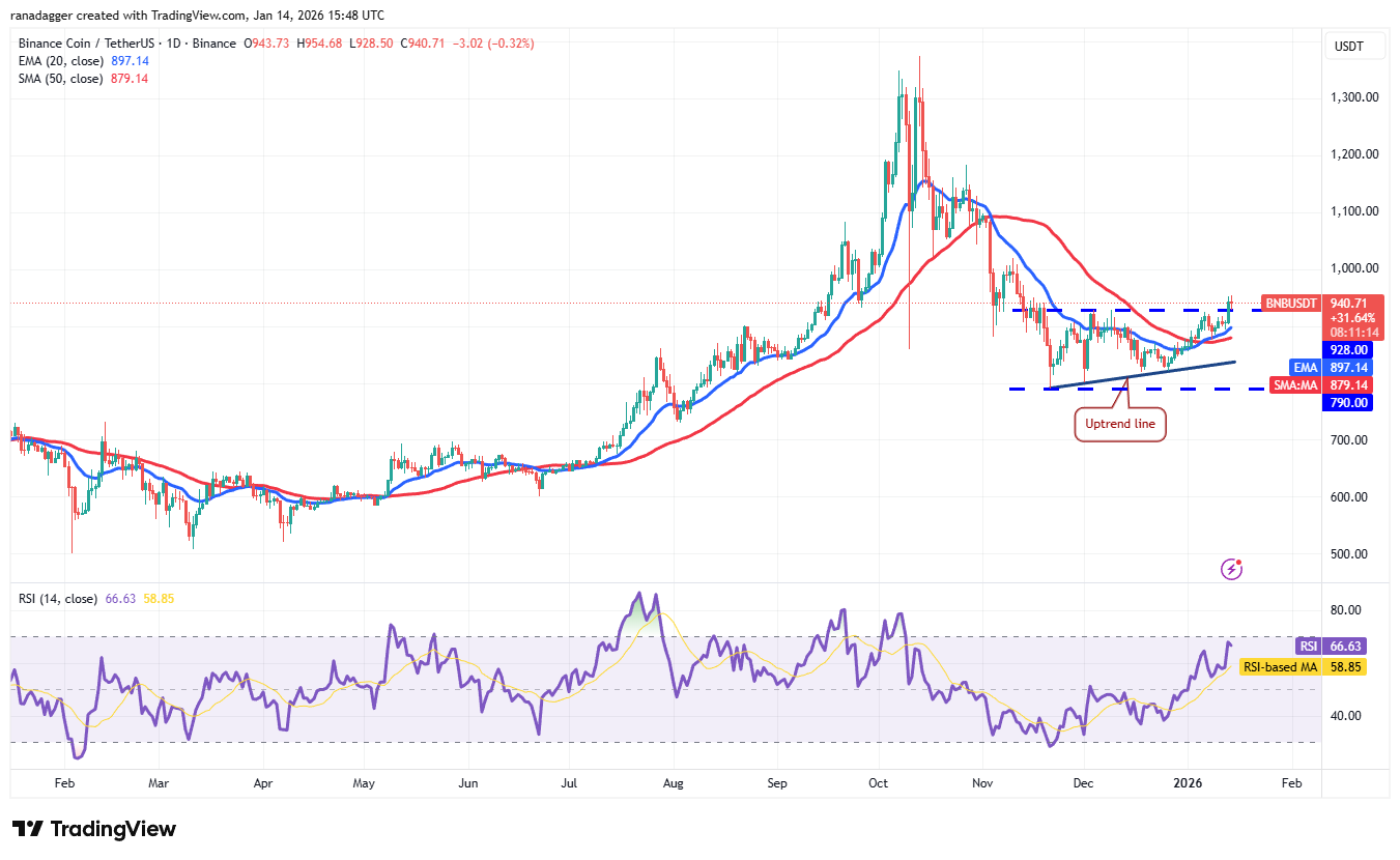 The bears will attempt to trap the aggressive bulls by pulling the BNB price below the moving averages. If they manage to do that, the BNB/USDT pair may drop to the uptrend line and then to the $790 level.