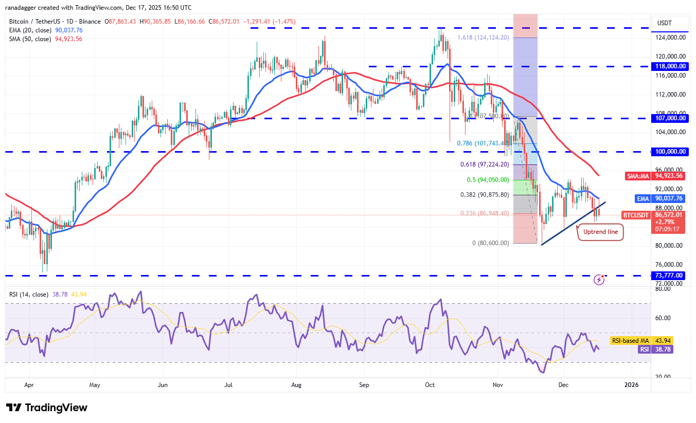 The first sign of strength will be a break and close above the 20-day exponential moving average ($90,037). The pair could then climb to $94,589 and subsequently to the psychological level of $100,000.