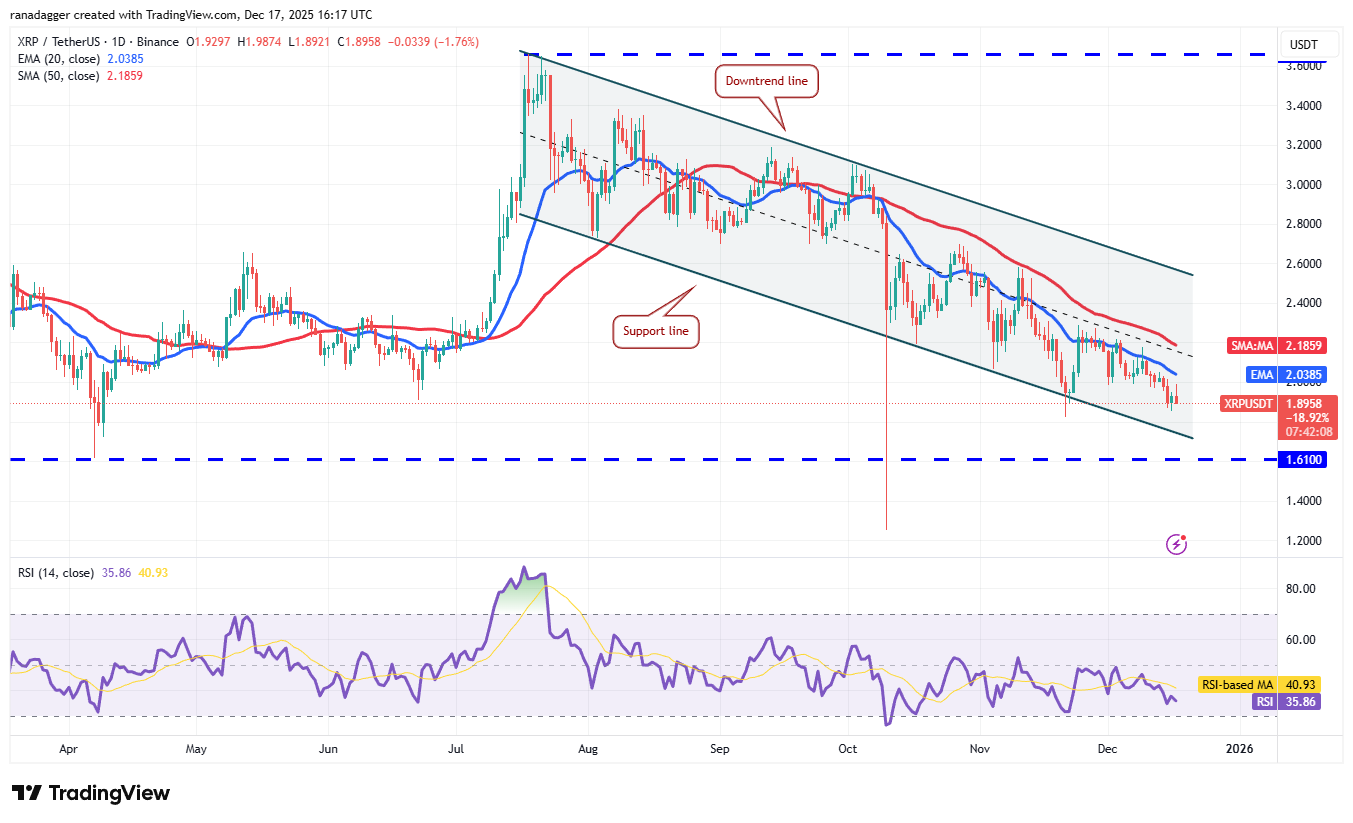 If the XRP price turns down from the moving averages, the possibility of a break below $1.61 increases. The XRP/USDT pair could then plummet to the Oct. 10 low of $1.25. On the other hand, a break above the downtrend line signals a potential trend change.