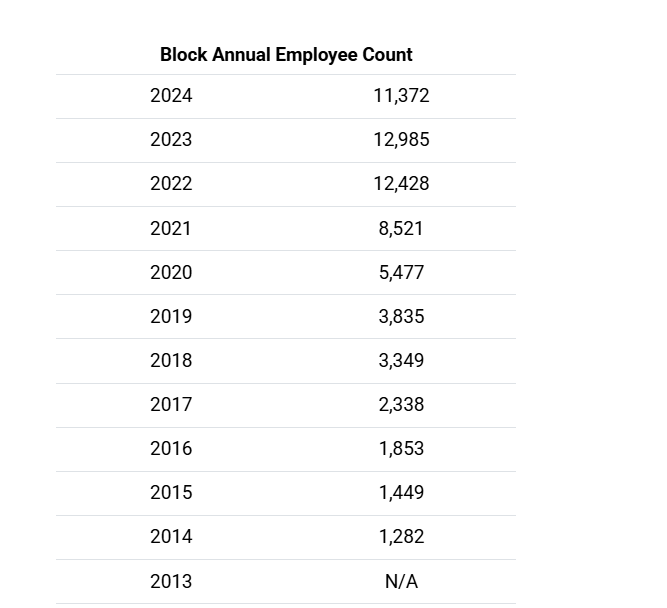 Financial data website Macrotrends estimates that in 2019, Block had roughly 3,835 staff, which grew to a peak of 12,985 by 2023, representing a 237% increase in four years.