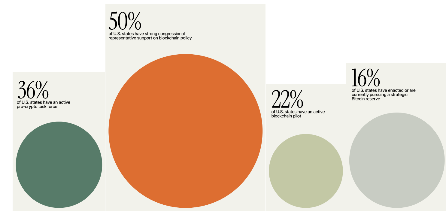 At least 50% of US states have strong congressional representative support on blockchain policy, while 36% have an active pro-crypto task force.