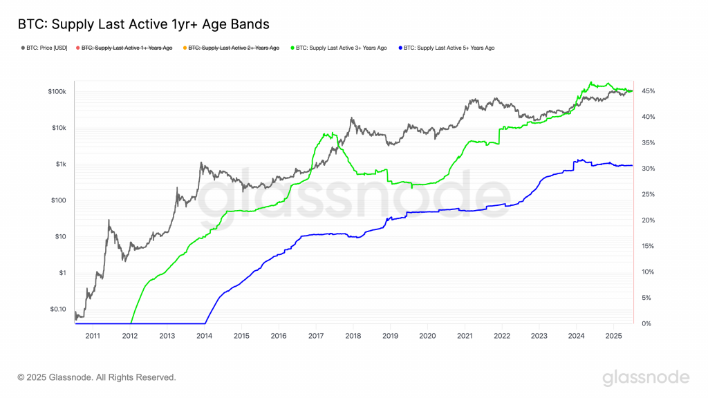 Meanwhile, the share of circulating supply that has not moved in at least five years is at 30% and has remained flat since May 2024.