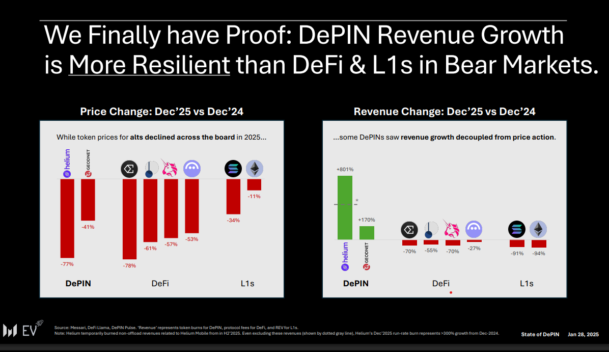 One of the report’s headline findings is that DePIN’s revenue growth has proven more resilient than decentralized finance (DeFi) and layer‑1s in the current bear market.
