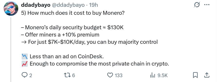 Dadybayo added that, while Qubic claims to have no intention to hurt Monero, “intent doesn’t matter.” He explained that centralization equals risk, and censorship potential is damaging to the network, concluding that incentives are a new attack vector: