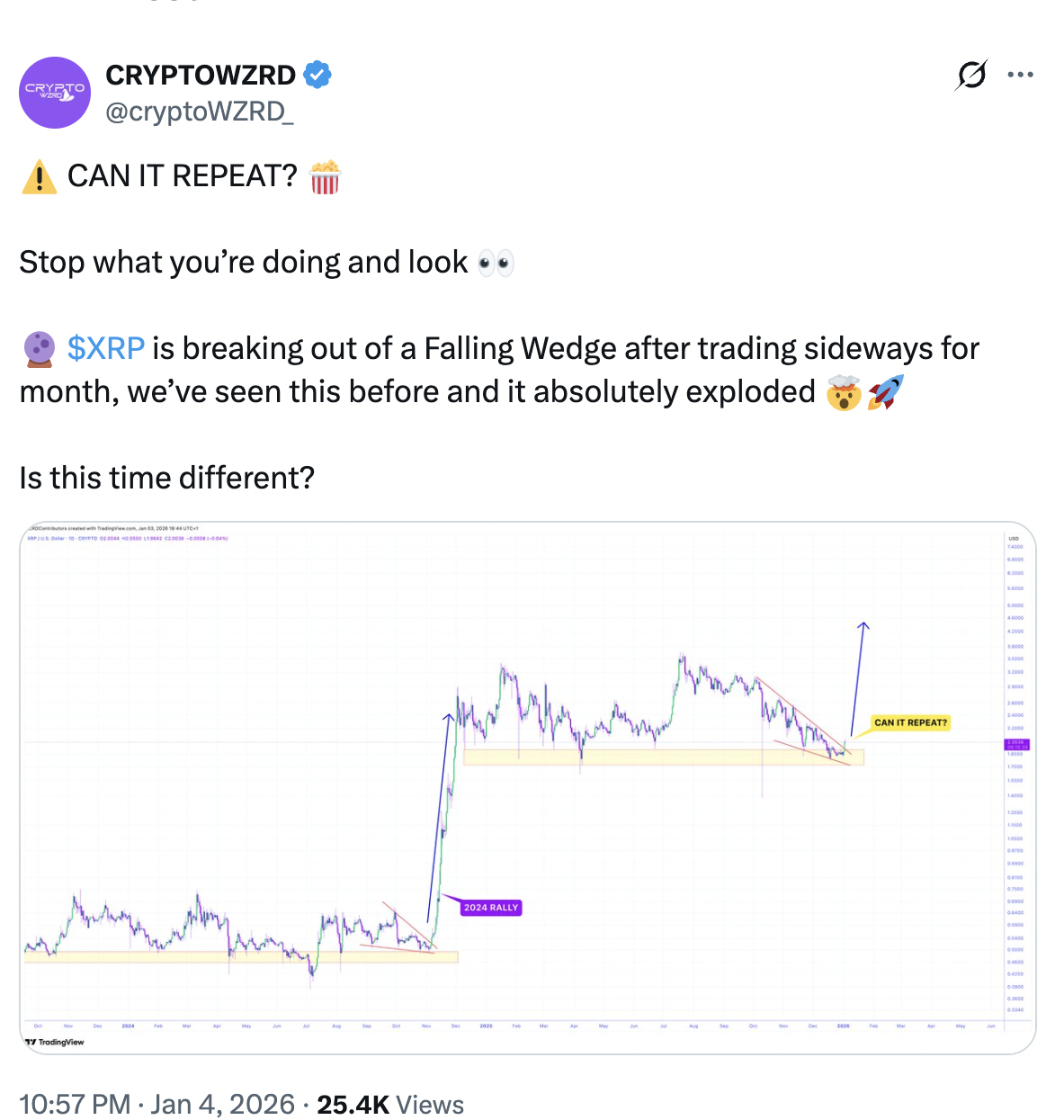 “$XRP is breaking out of a Falling Wedge after trading sideways for a month”, Trader CryptoWIZRD said in a recent post on X, adding that the last time this happened was in Q4/2025 when the price “exploded” 486%.