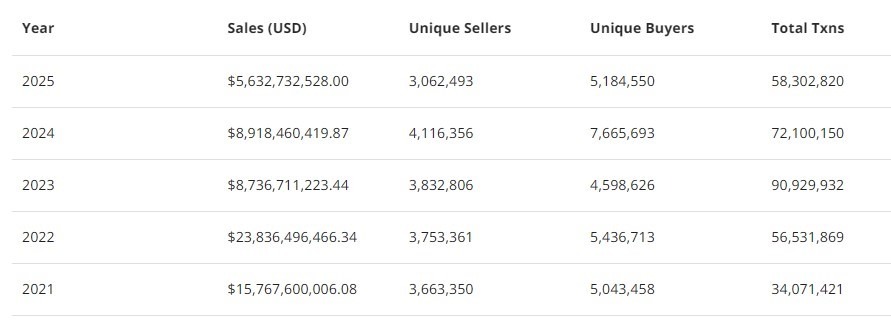 CryptoSlam data shows that the total number of NFTs in circulation climbed to more than 1.34 billion this year, marking a 25% increase from the one billion supply in 2024. The increased supply came in parallel with falling sales.
