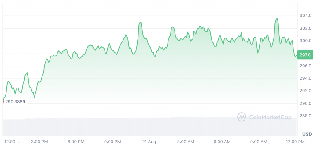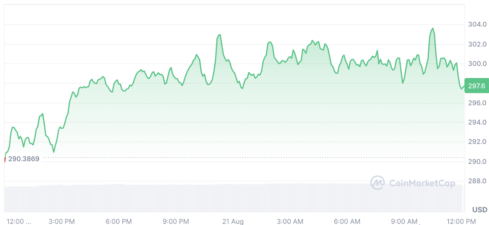 Aave is trading near $300, with a market cap of $4.56 billion and daily turnover approaching $1 billion. The protocol underpins decentralized lending markets, supporting both collateralized loans and staking.