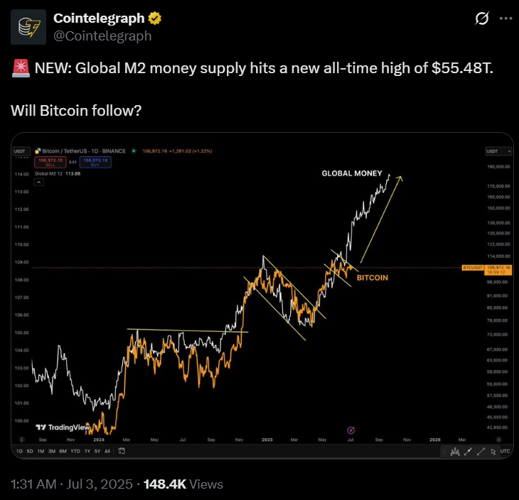 Stocks and crypto markets also appear to be closely tracking global M2 money supply — a correlation that first gained attention during the pandemic, with Bitcoin typically following global liquidity trends on a three- to six-month lag.