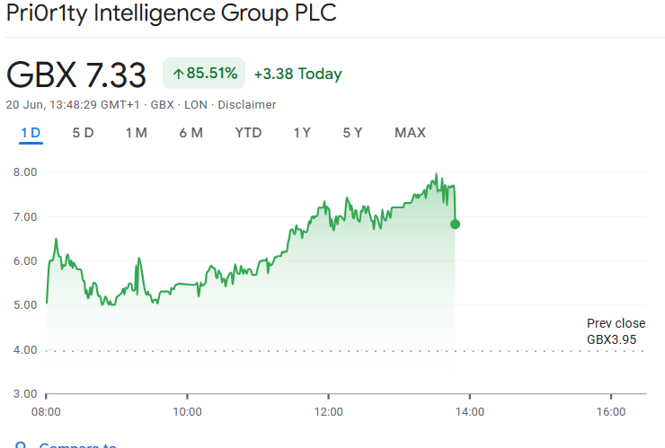 Pri0r1ty Intelligence Group (GBX) stock, 1-day chart. Source: Google Finance