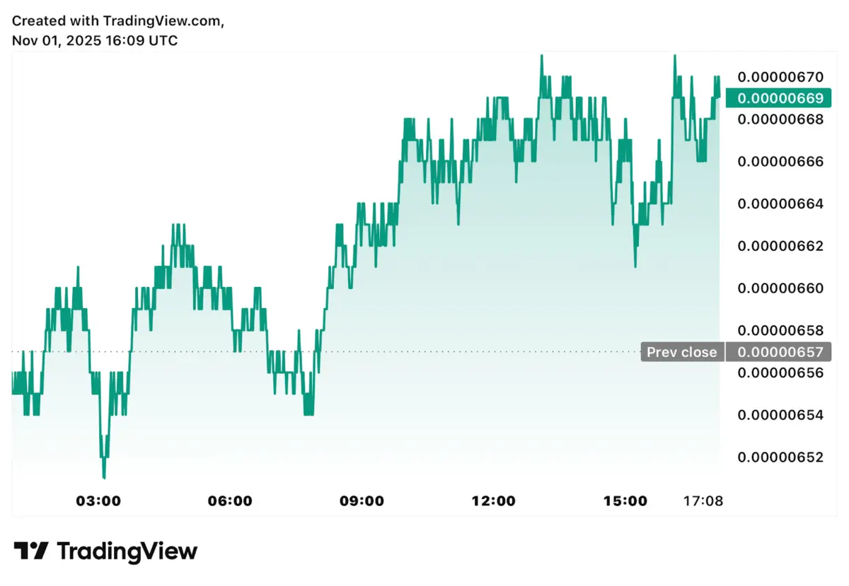 PEPE is currently trading at about $0.00000670, with support at $0.000010. In the last 48 hours, Pepe’s trading volume has increased by almost 20%, according to analysts, indicating a fresh surge in retail activity.