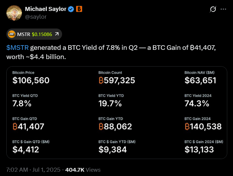 Strategy has amassed 597,325 BTC, generating a Bitcoin yield of 7.8% in the second quarter, according to Chairman and founder Michael Saylor. The company continued to stack sats last week, acquiring $531 million worth of BTC.