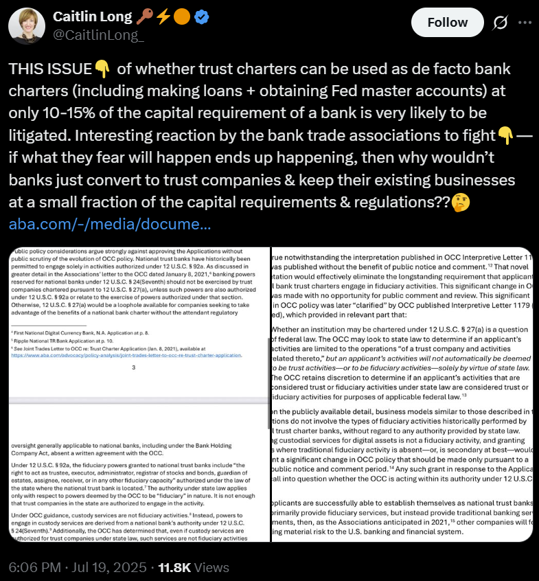 Long argued that the question of whether trust charters can function as de facto bank charters — allowing institutions to make loans and obtain Federal Reserve master accounts with only a fraction of the capital required of full-service banks — is “very likely to be litigated.”