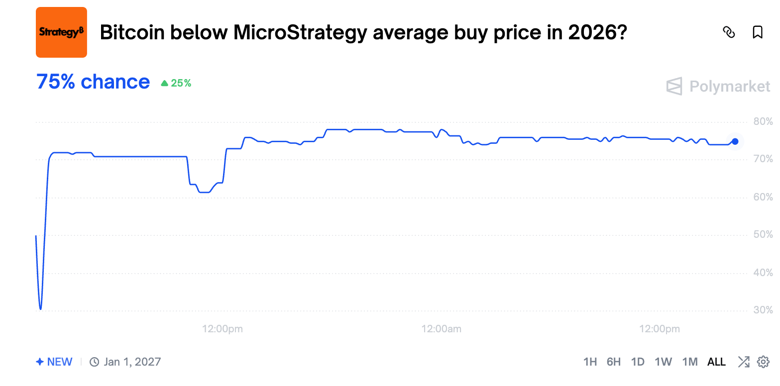 Traders on Polymarket set a 75% chance that Bitcoin will trade below Strategy’s average BTC cost price in 2026, which was $75,979  at the time of writing.