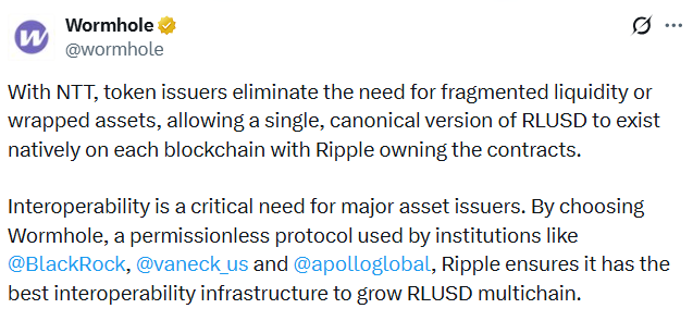 The Wormhole team said in an X post on Monday that its Native Token Transfers standard will allow RLUSD to move across blockchains as the real token, as opposed to a synthetic or wrapped copy, which will help maintain liquidity.