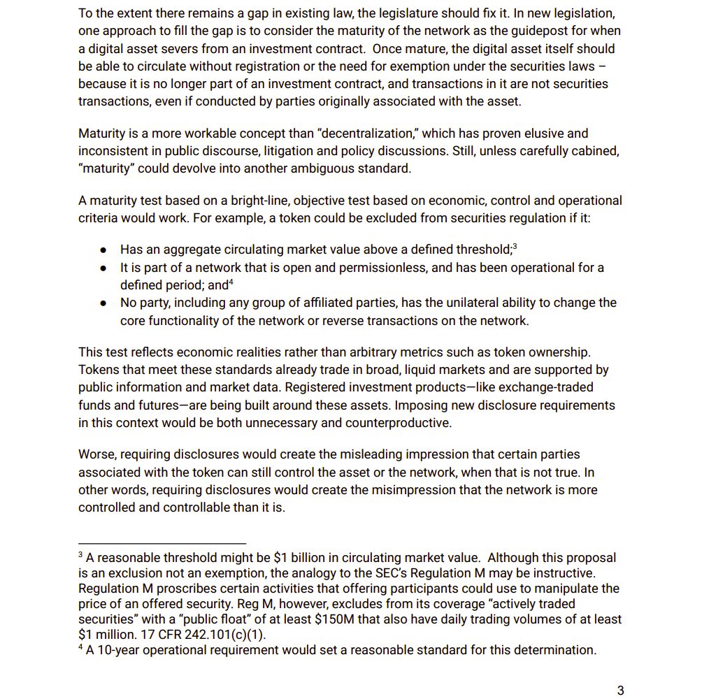 Under this approach, tokens could be excluded from securities regulation if they meet specific criteria, such as a high market capitalization, a long-operating, permissionless network, and the absence of any party with unilateral control over the protocol.