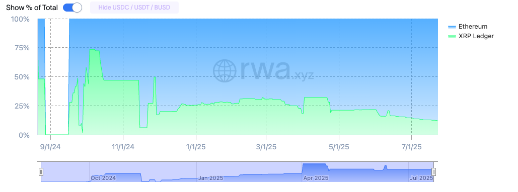 RLUSD market cap by network (EVM sidechain versus XRPL). Source: RWA.xyz