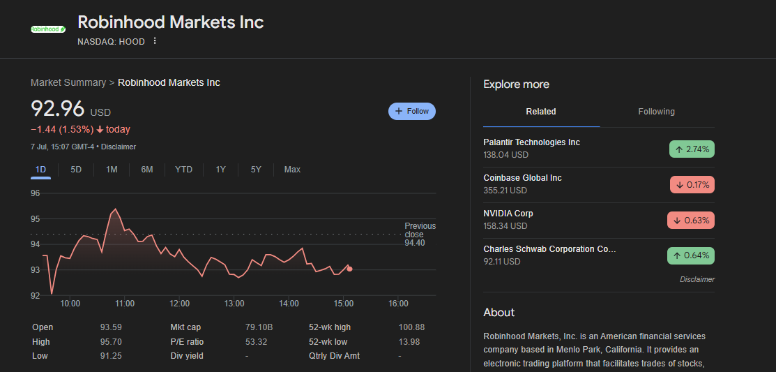 But the momentum has since cooled. At the time of writing, Robinhood shares are trading at $92.96, down 1.45% on the day.