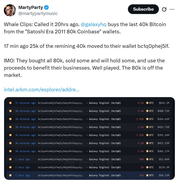 A Satoshi-era Bitcoin whale with 80,201 Bitcoin has shifted the other 40,192 Bitcoin, worth $4.77 billion, to Galaxy Digital, joining a 40,009 BTC transfer to the asset manager on Tuesday.