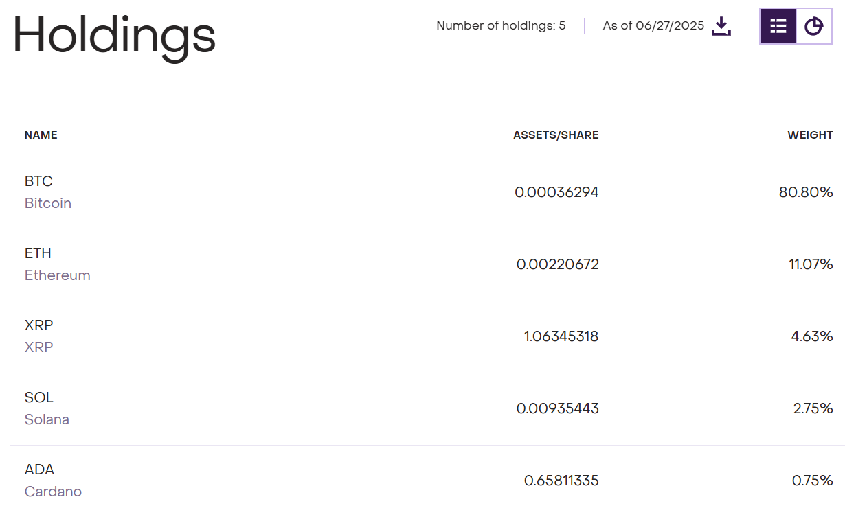 Grayscale’s GDLC fund is designed to track a mix of five major crypto assets, with the bulk in Bitcoin (80.8%) and the rest spread across Ethereum (11.07%), XRP (4.63%), Solana (2.75%), and Cardano (0.75%).