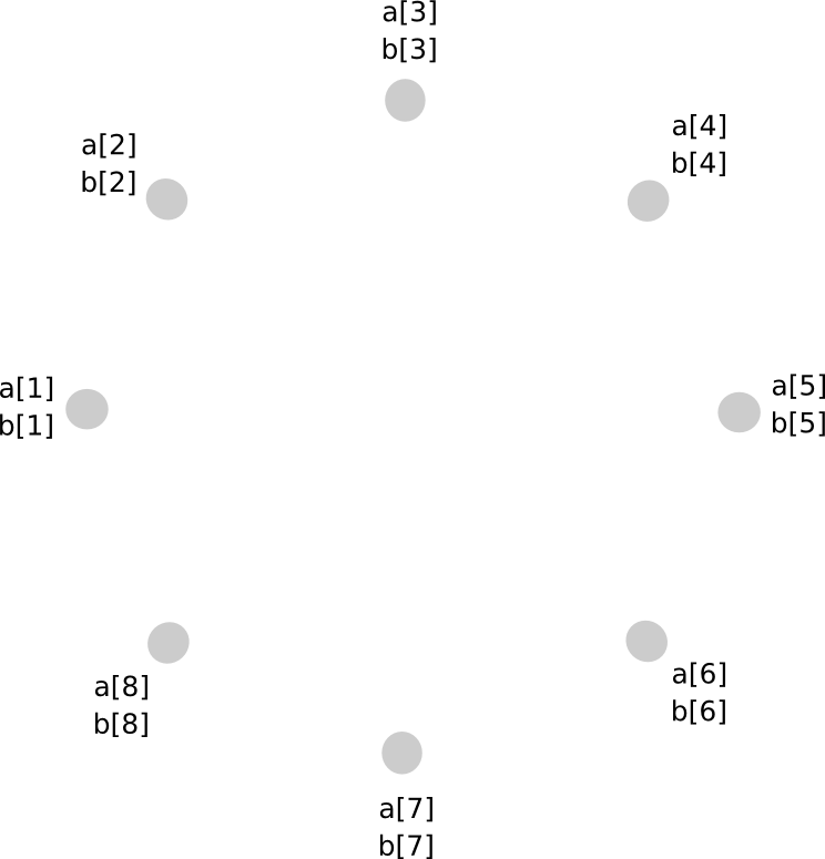 Multiplication of two secret shared values, unfortunately, is much more involved. The approach will take several steps to explain, and because it is fairly complicated in any case it’s worth simply doing for arbitrary polynomials right away. Here’s the magic. First, suppose that there exist values a and b, secret shared among parties P[1] … P[n], where a[i] represents the ith share of a (and same for b[i] and b). We start off like this: