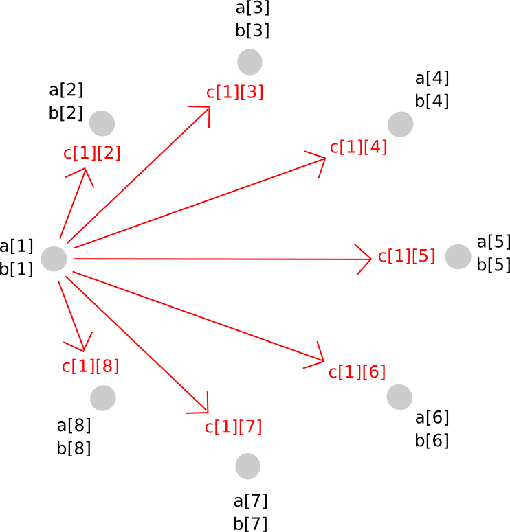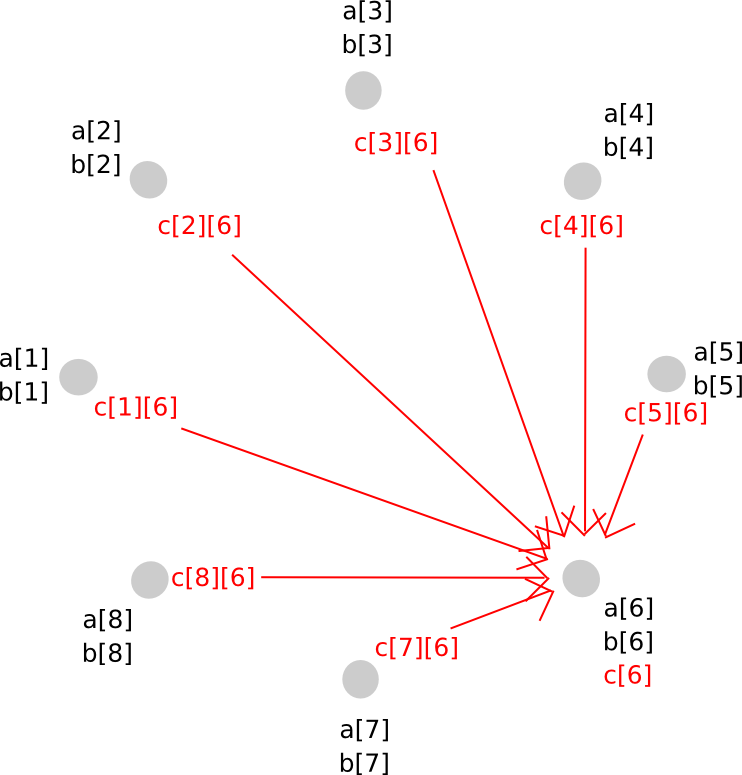 Suppose that the x=1 point of both lines A and B is stored by computer P[1], the x=2 point is stored by computer P[2], etc. Now, suppose that P[1] computes a new value, C(1) = A(1) + B(1), and B computes C(2) = A(2) + B(2). Now, let’s draw a line through those two points: