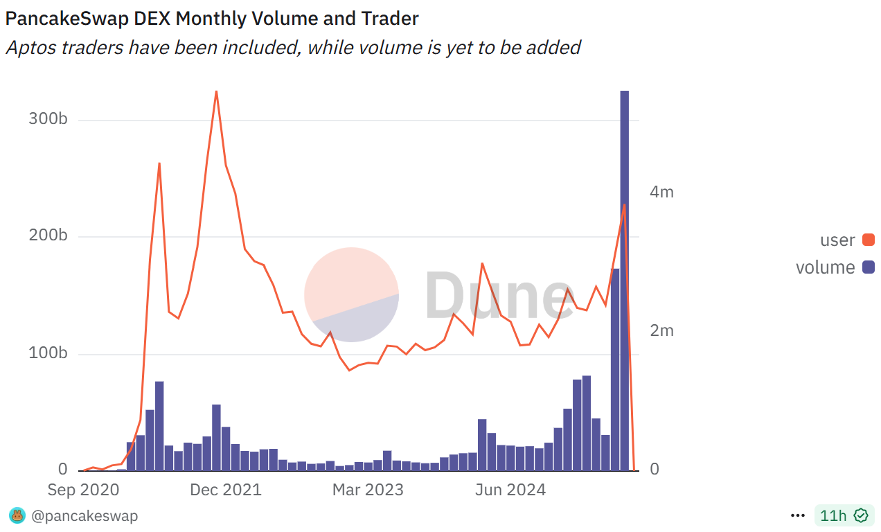 PancakeSwap DEX monthly volume and trader Source: Dune Analytics