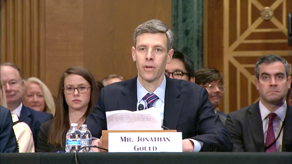 Jonathan Gould speaking at a nomination hearing before the Senate Banking Committee in March. Source: Senate Banking Committee