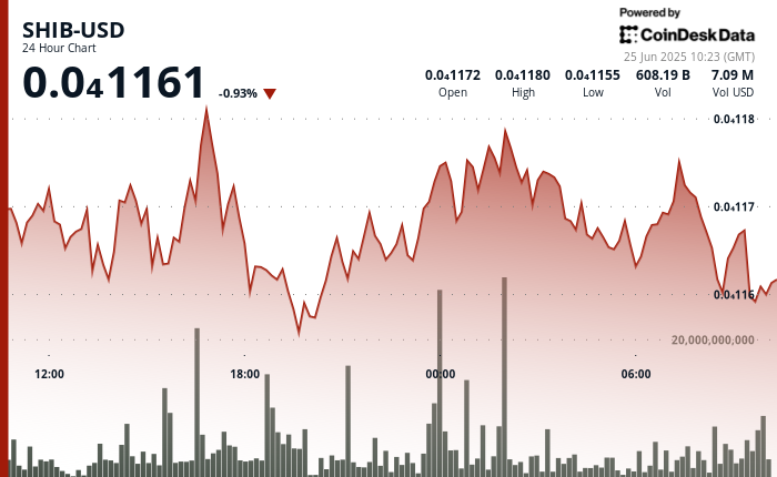 - During the 60 minutes from 25 June 07:06 to 08:05, SHIB climbed from $0.00001169 to $0.00001171, representing a 0.2% gain.