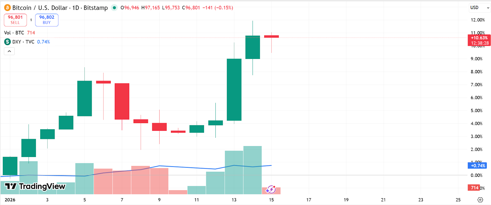 Bitcoin’s price rose 10.6% year-to-date, while the US Dollar Index (DXY) rose 0.75% during the same period, according to TradingView.